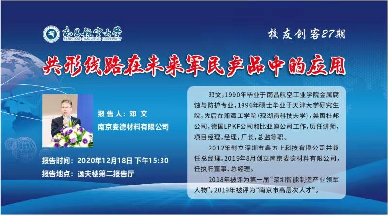 At 15:30 on December 18, 2020, General Manager Kennedy Deng attended the alumni maker seminar of Nanchang Hangkong University (NCHU) and gave a report "Application of conformal circuit in future military and civil products" for the teachers and students in the 2nd lecture hall of Sir Run Run Shaw Building. Combined with his own work experience, Kennedy gave a wonderful speech about the characteristics of three-dimensional circuit and its application in industrial manufacturing, 5G technology, intelligent automobile and military fields, and he said, "all the students, especially those majoring in science and engineering, should read more books on humanities, philosophy, astronomy, geography and so on, at the same time, they should not stick to books, jump out of books, and grow into talents with all-round development, and bloom the most beautiful themselves in the best times."